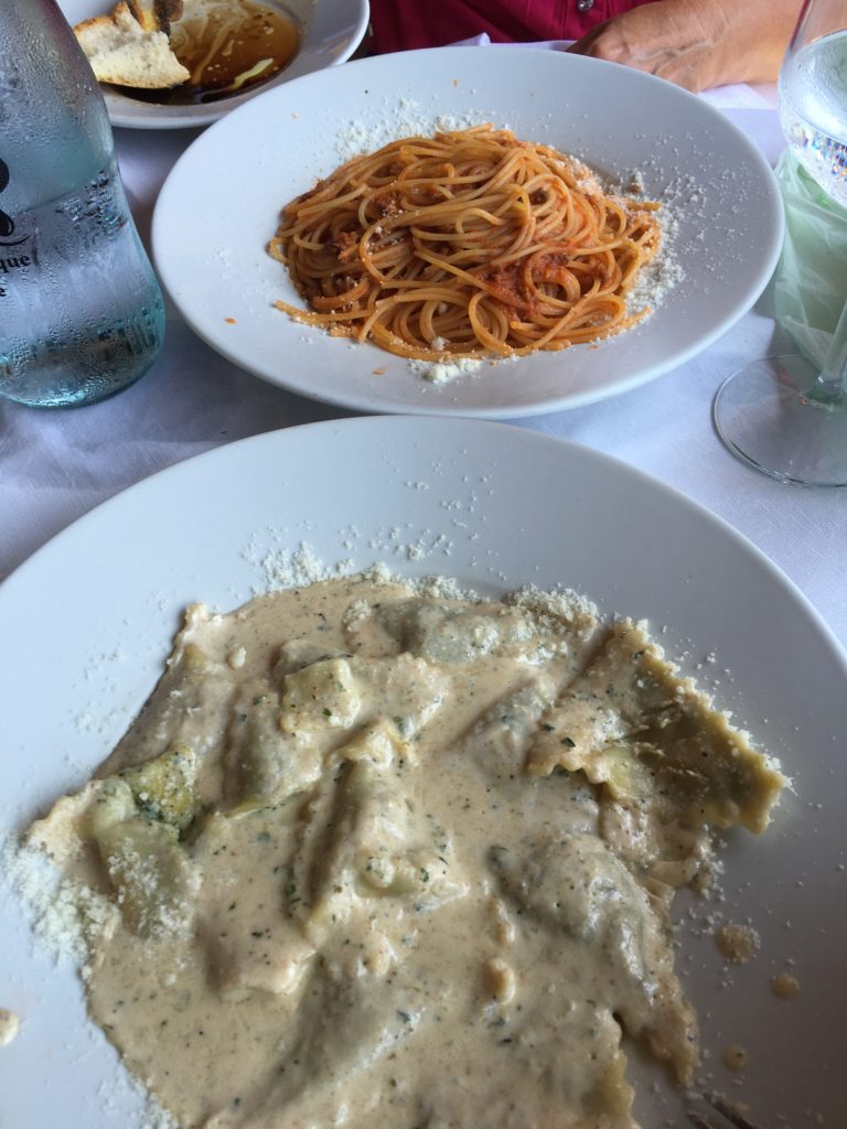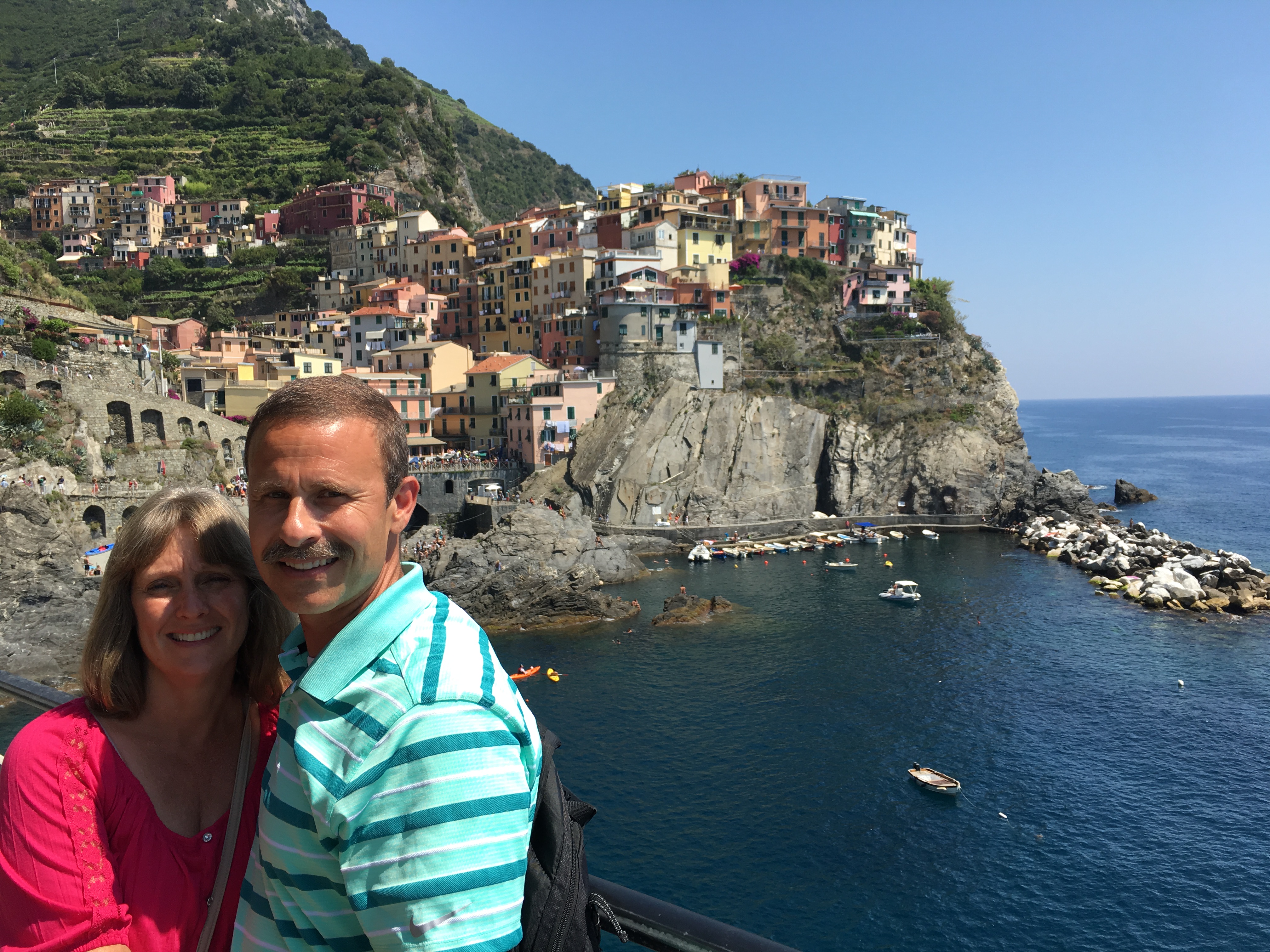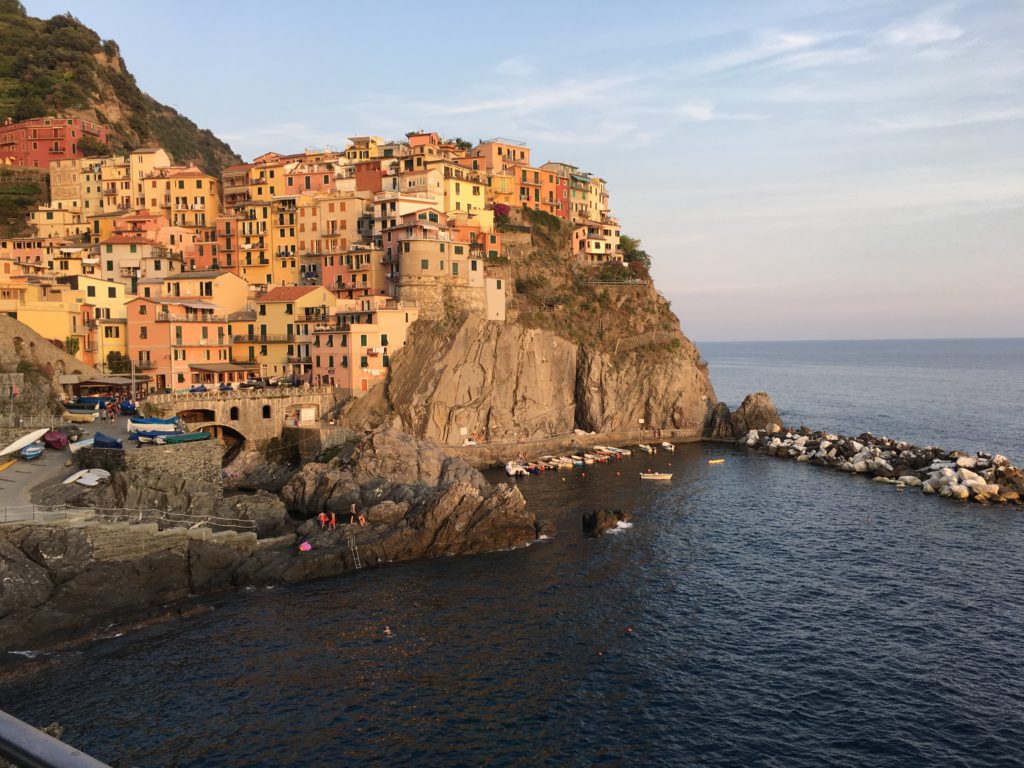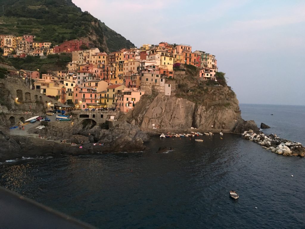 We took the evening trek down the hill to dinner at a fabulous restaurant overlooking the Manarloa cove. Taking the first open table I was scolded and directed out, I need to learn the process of requesting a table. Our service was great from that point on as we dined in the shade with a breeze from the Mediterranean cooling our foreheads from the thirty five Celsius heat. I gambled a little and ordered Pesto Ravioli in Walnut Sauce, no disappointment in this selection nor was the pasta Kellie ate. Finishing dinner we went to take a photo at dusk of the lovely town, we were met with a plethora of camera going others wanting to capture just that right photo with the shades we all see on the websites. I believe we captured ours as well as spent some quiet time reflecting on our day.