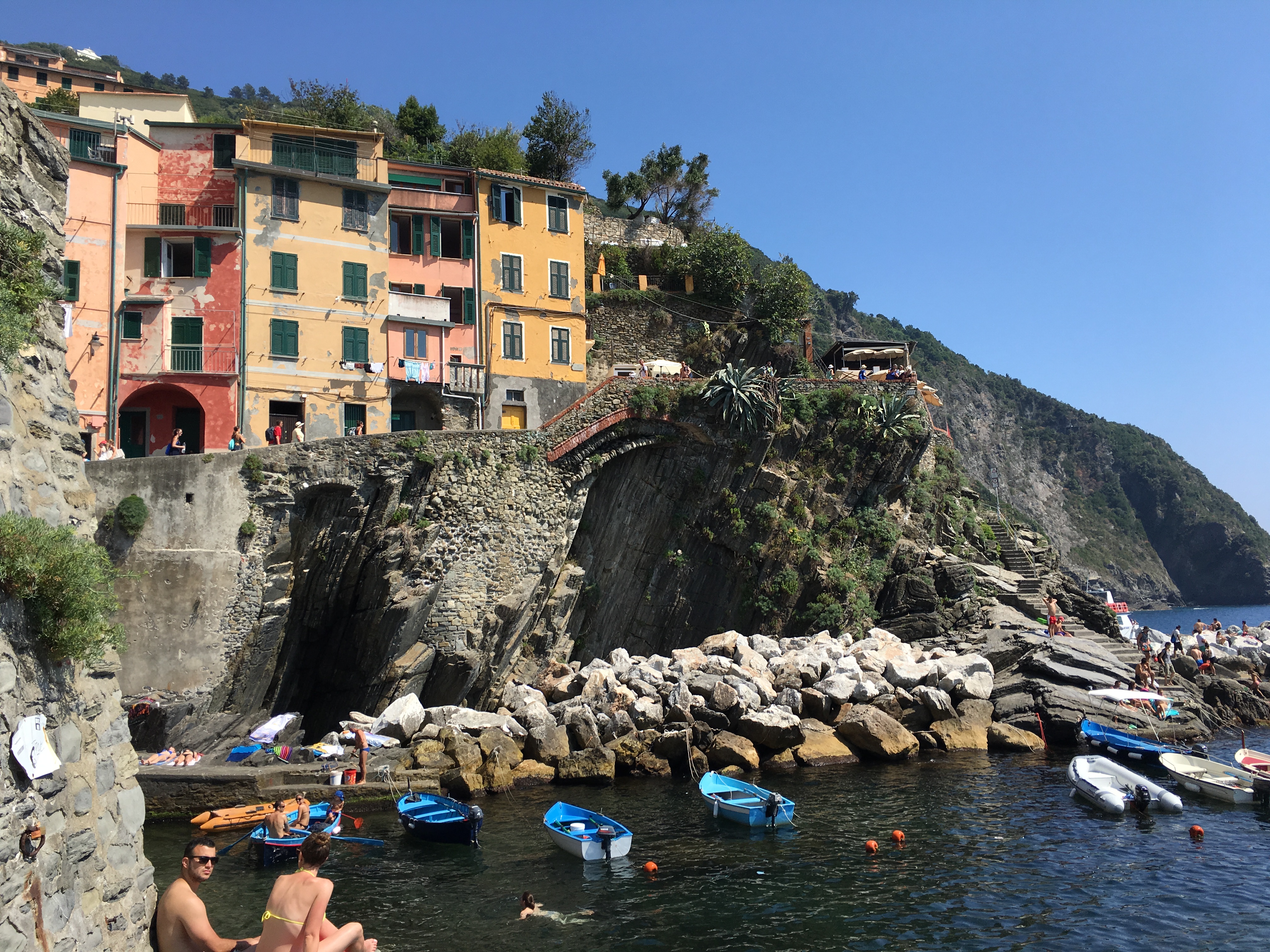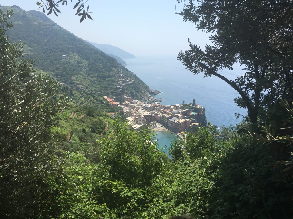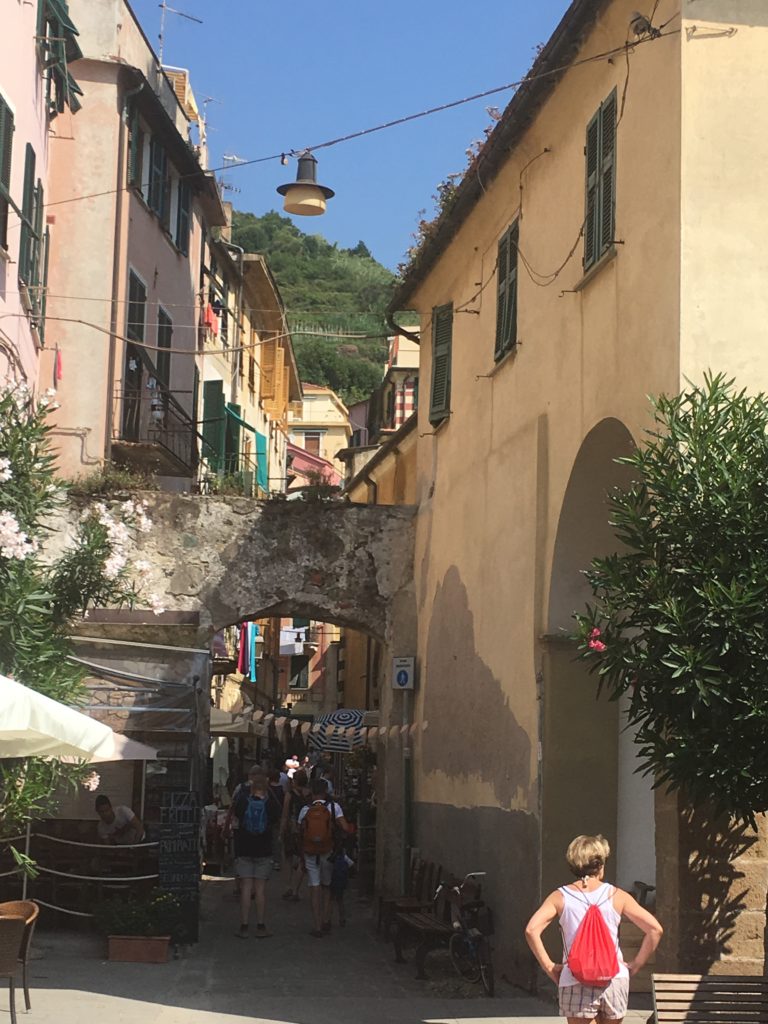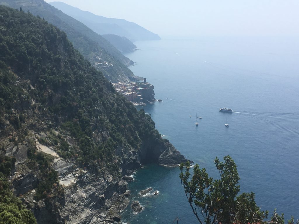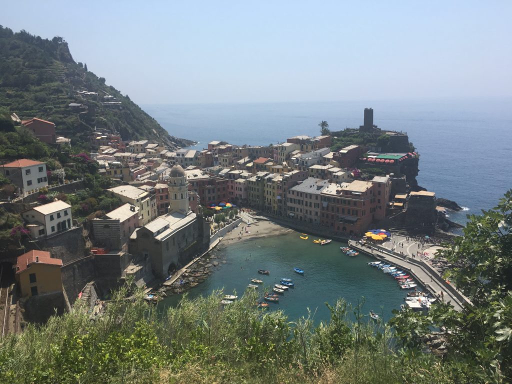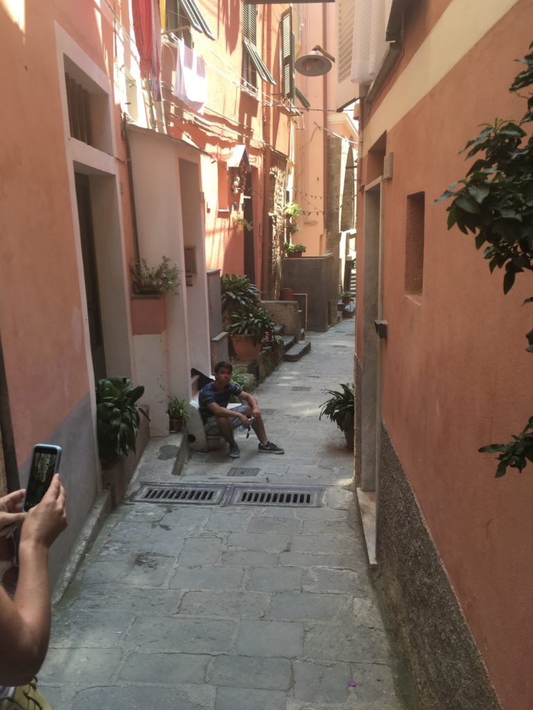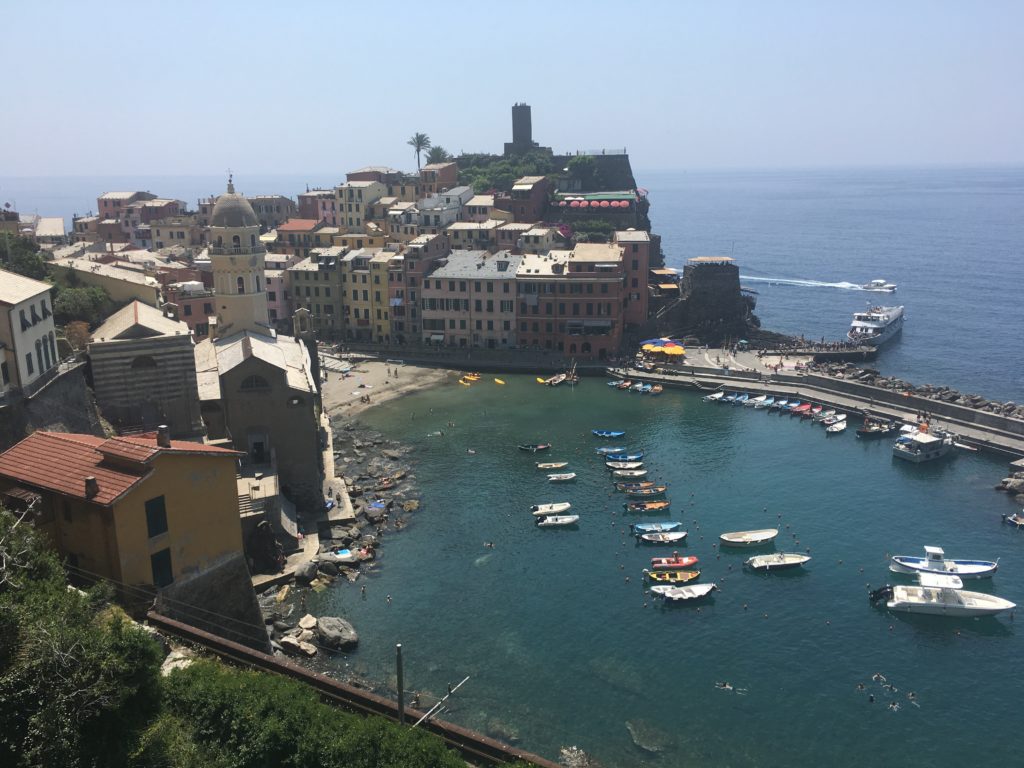 Reconnecting for a short time we set off on a beach walk through Monterosso. Starting at the morning market was an opportunity to purchase a few things as well as some fruit for the walk. A wide easy road gave us the opinion that the pedestrian path to Vernazza was going to be relaxing full of conversation and photos of the sea. We bit! Sweating, slightly out of breath we rested at a point where you are not sure if it is better to turn back and train to the next town or continue ahead as you are at the pinnacle of difficulty and will be rewarded soon. Those stops and thought process happened no less than four other times. The views were spectacular, conversation with family engaging and enjoyable as well as the occasional resident creating a refreshment stand around the bend. The fresh squeezed orange juice was delicious and had a rejuvenated component. We made it to the beautiful town of Vernazza, had some indulgences of food and drink, sitting relaxed on a stone bench watching tourists and locals play in the shallow clear waters of the Mediterranean. A little damp we dropped off the train at our town to change ready to finish our exploring.
