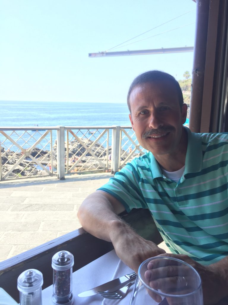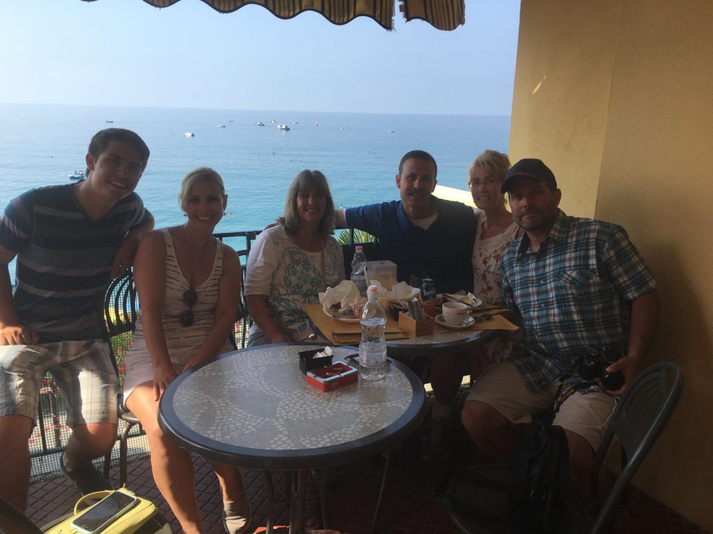 Rising leisurely we found a lemon in our courtyard that had fallen from the tree and placed it in the refrigerator for later, it created a sensational lemon smell on our hands. We caught the 9:08 train to Monterosso al Mare’ wanting to meet up with my sisters Stephanie, Mari, our brother-in-law Dave and nephew Eric. Hungry we jumped from the train to a cafe overlooking the beach and called them making our location known. What a great plate of eggs, bacon, toast, a crappy cup of coffee and a cool glass of orange juice to start the day.