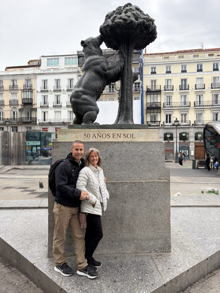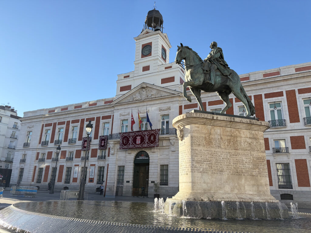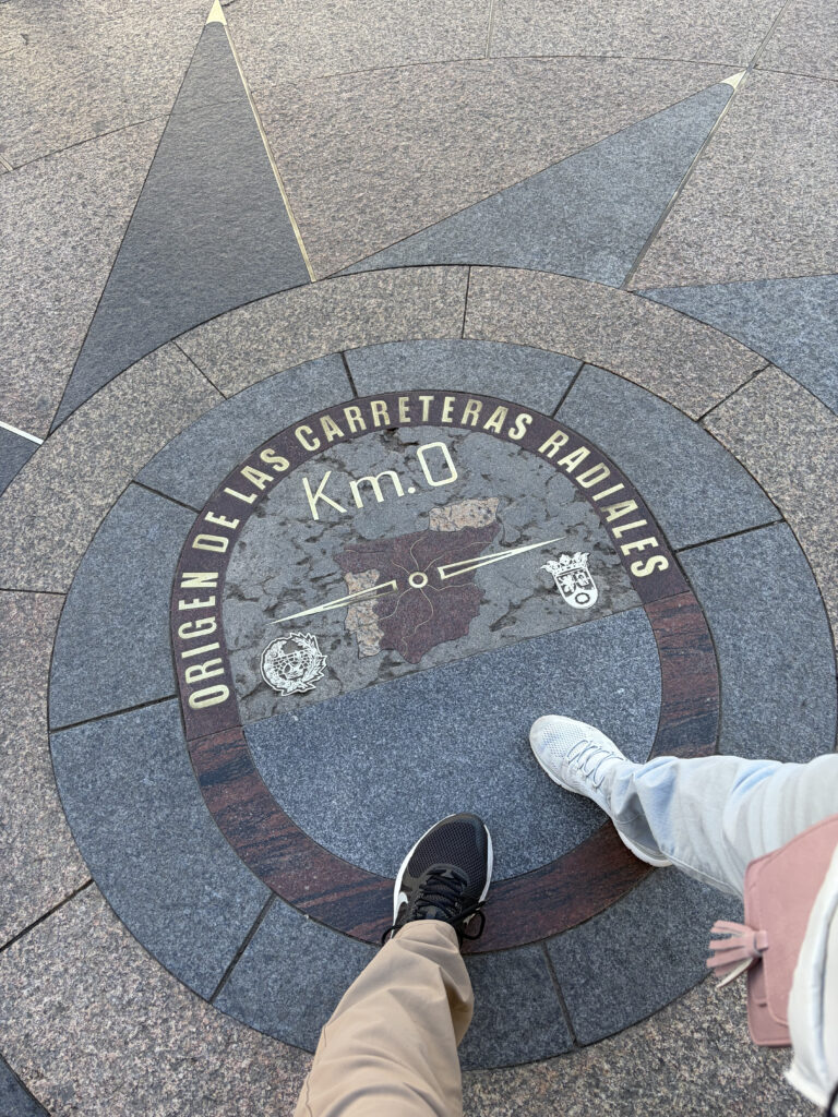 By the time we reached Puerta del Sol, the city had fully woken up. It’s one of those places that feels like everything radiates outward from it—which is actually true. Spain’s “Kilometer Zero” marker sits here, quietly marking the center of the country’s road network. Street performers, tourists, locals cutting across the square—it all blends into this constant motion. There’s also the famous bear and strawberry tree statue, symbol of Madrid, which felt oddly grounding in the middle of all that energy.