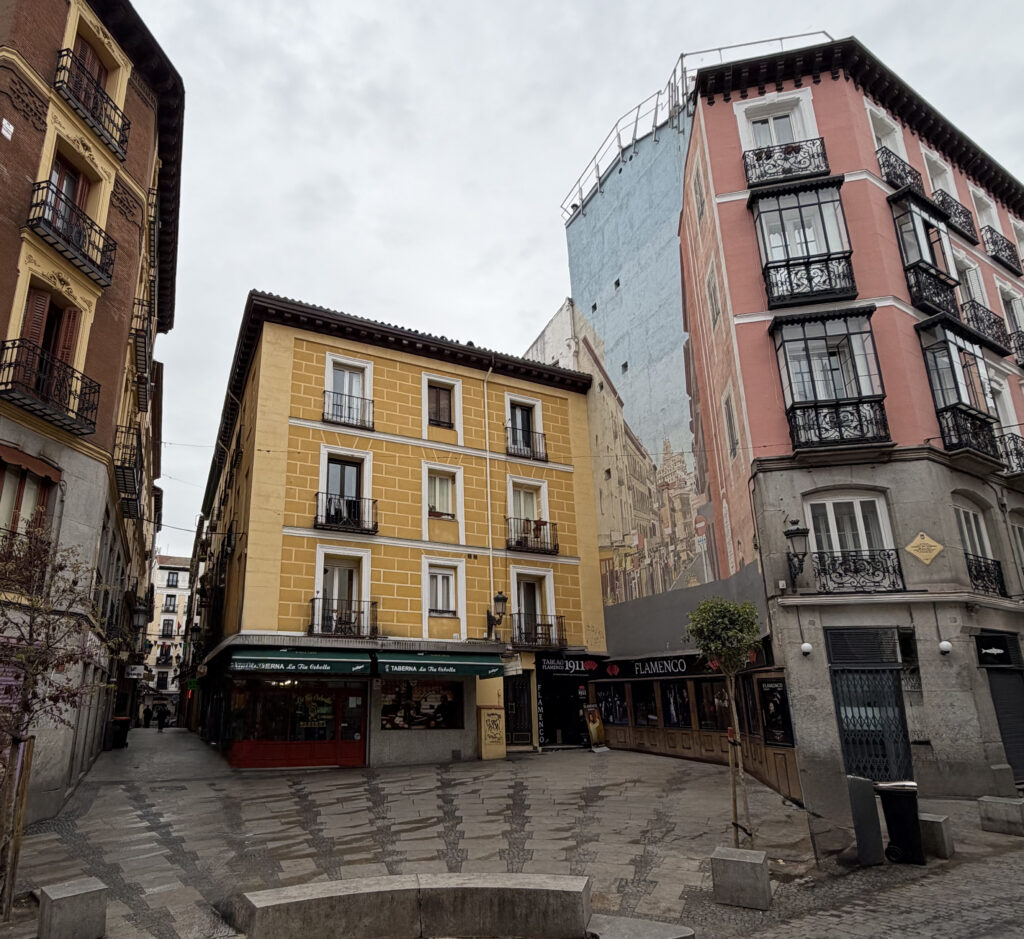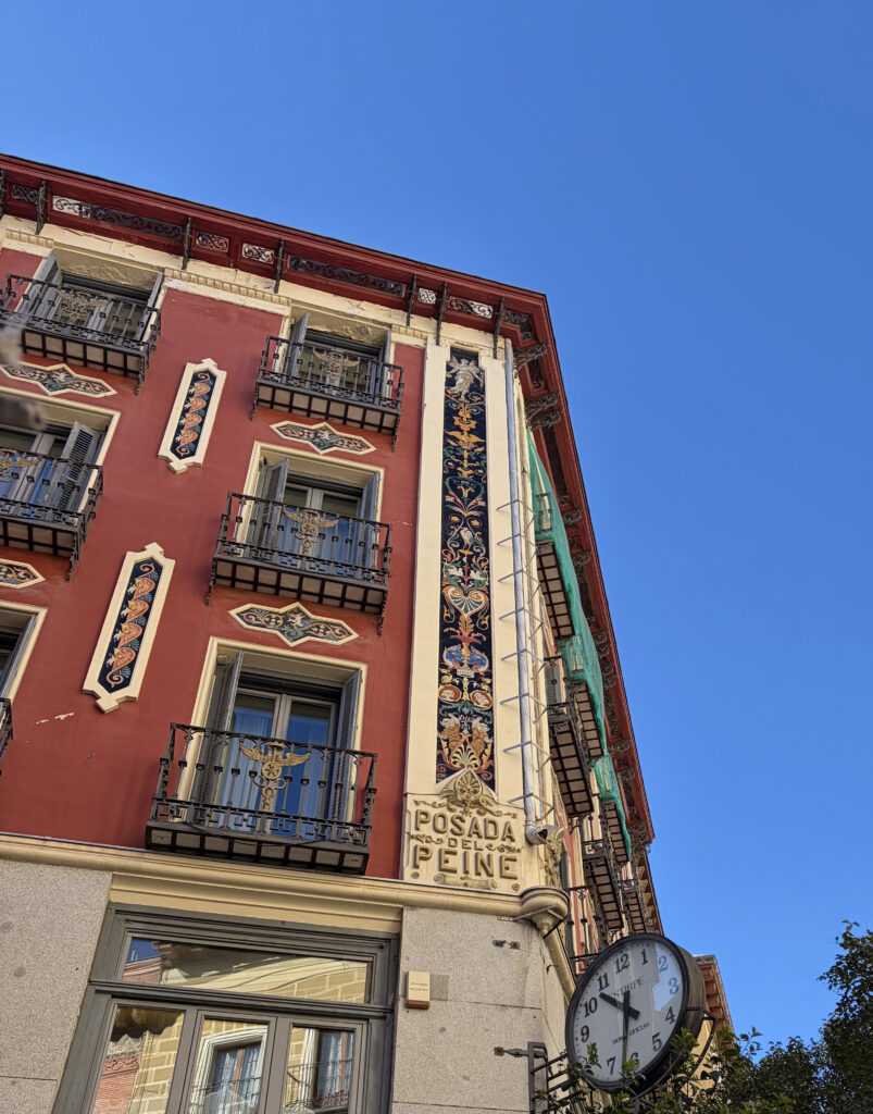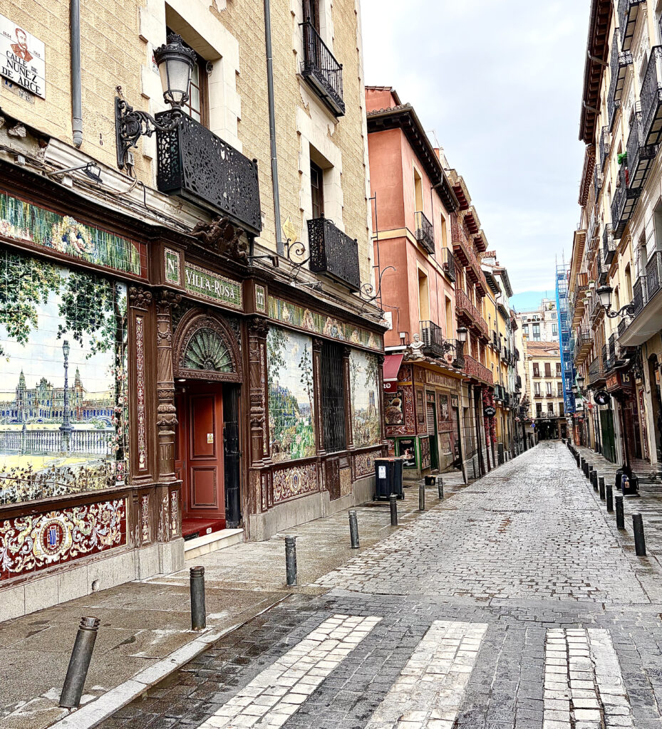 Walking along Calle de las Huertas, we started noticing the quotes—actual lines of poetry and prose embedded into the pavement. You end up looking down as much as around, which slows you down in a good way. Cafés were just opening, chairs scraping lightly against stone, the smell of coffee drifting out into the street.