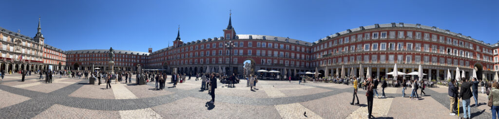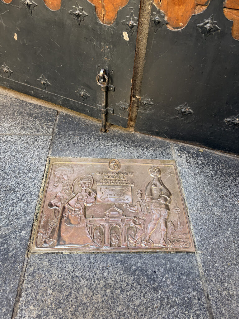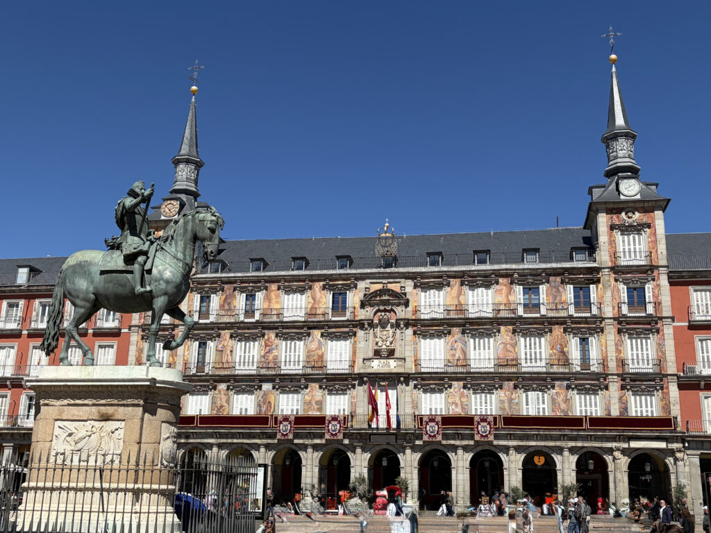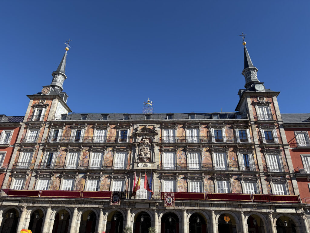A short walk brought us to Plaza Mayor, and suddenly everything shifted. The noise softened, the space opened up, and those uniform red buildings wrapped around us like a stage set. It’s hard not to imagine the history here—public markets, royal ceremonies, bull fights, even executions during the Spanish Inquisition. Today it’s calmer, lined with cafés and artists, but you can still feel that layered past if you slow down long enough. No church here to collect taxes so that is why it was moved from Toledo.