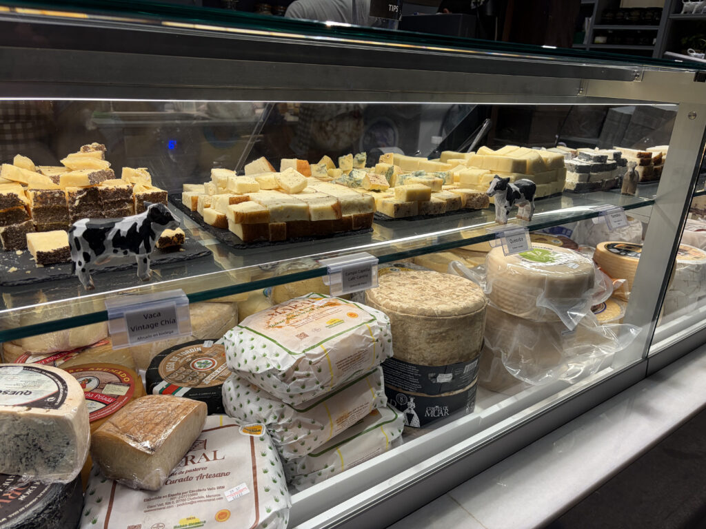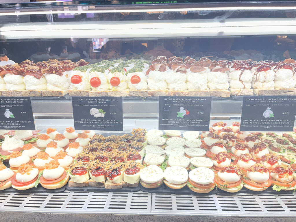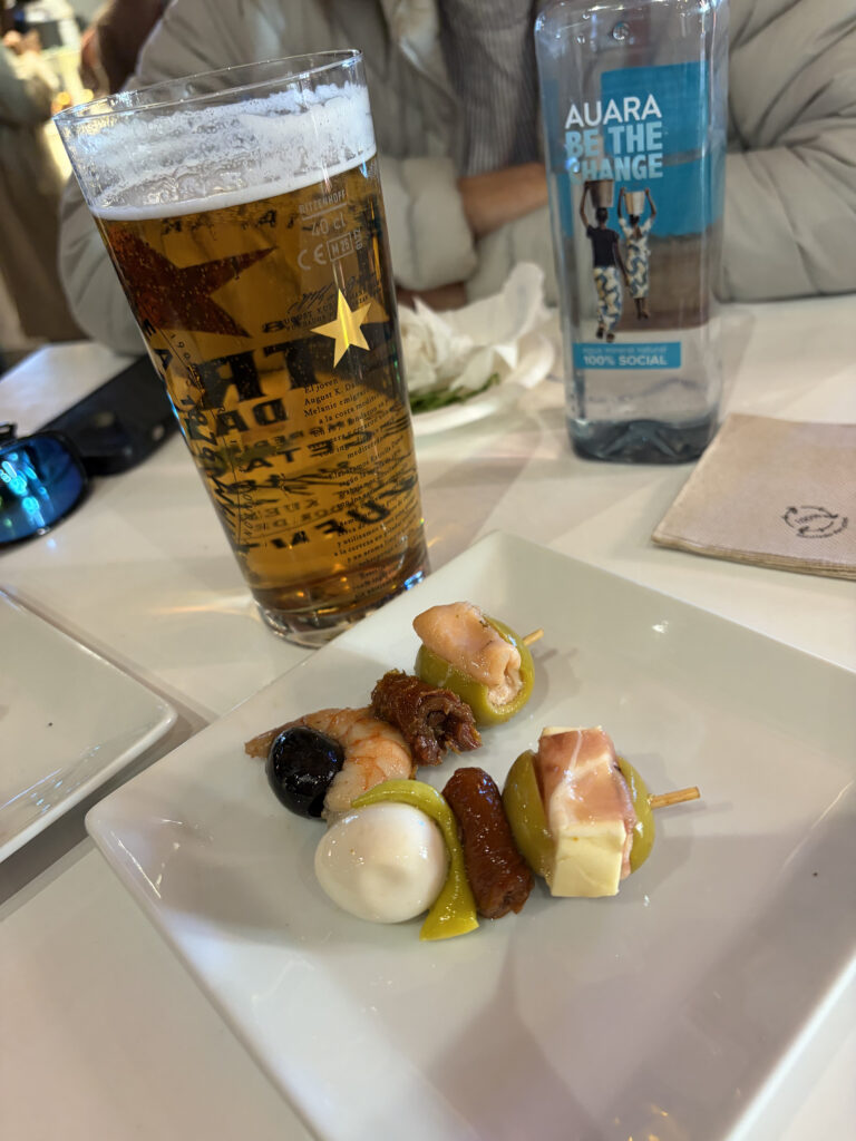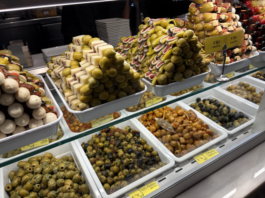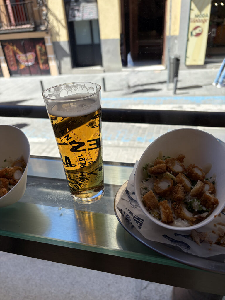 From there, it was on to Plaza de San Miguel, which kind of acts like a gateway to one of the best stops of the day. Right next door is Mercado de San Miguel, where we ended up circling more than once before committing to lunch. It’s all glass and iron—originally built in 1916—and inside it’s just… everything. Jamón, olives, seafood, little glasses of wine. We picked our way through different stalls, sharing bites, standing at counters, pointing at things we didn’t fully understand but absolutely wanted to try. Easily one of those meals you remember more for how it felt than what you ordered.