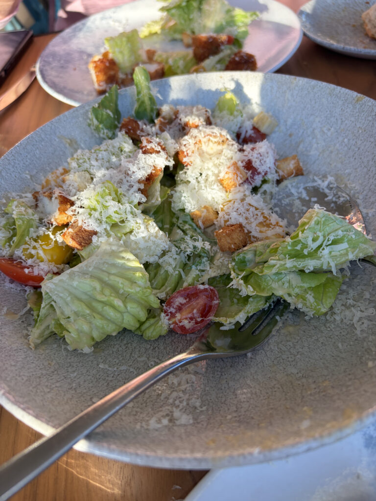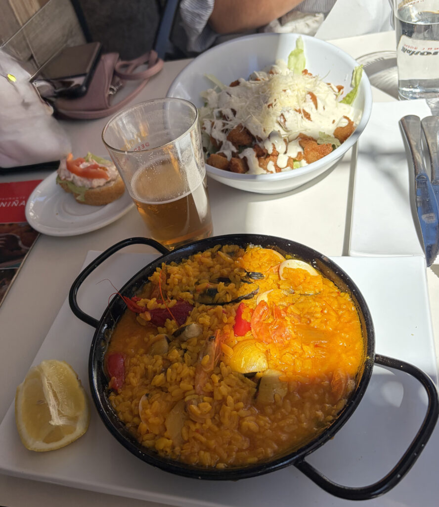We eventually wandered out through one of the gates, hungry in that very specific way that only comes after a long walk. Found a small place just outside—nothing fancy—and ordered shrimp paella and salad. It came out steaming, that deep saffron color, the kind of dish that doesn’t need explaining.