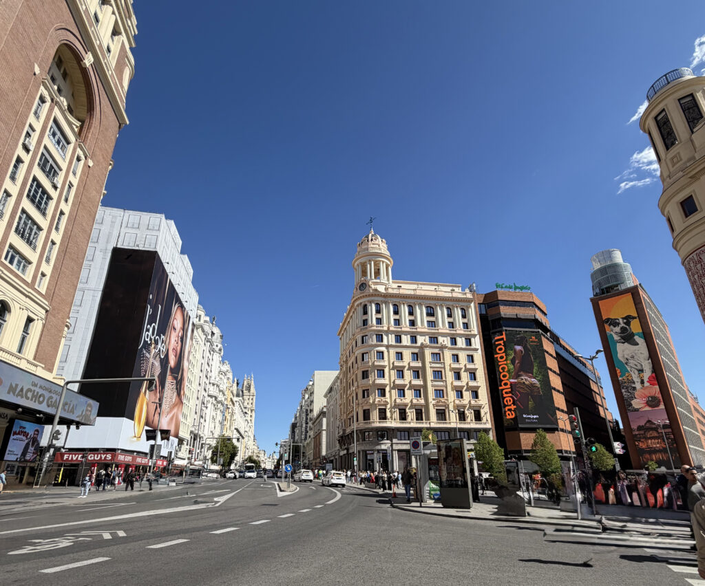 We drifted into Plaza de Callao just as the city was stretching awake. It’s loud later in the day—Madrid’s version of Times Square—but in the morning it felt almost cinematic. The old Edificio Capitol with the Schweppes sign was still catching the early sun, a reminder that Gran Vía wasn’t always neon and crowds—it used to be Madrid’s bold, early 20th-century leap into modernity.