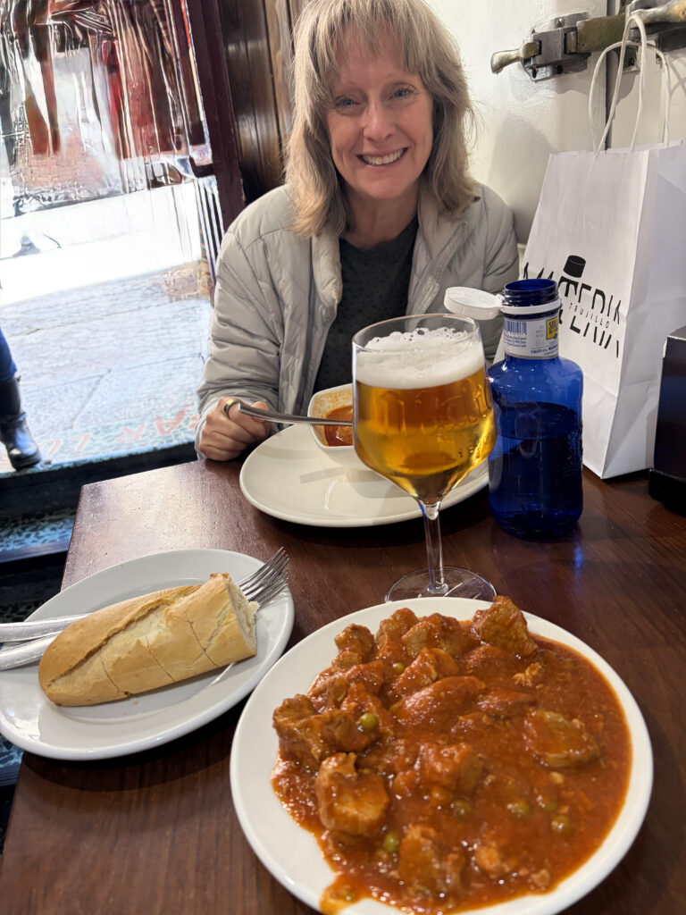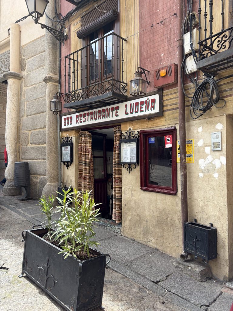 By the time we stepped back outside, Toledo had filled in. The narrow streets were alive now, voices bouncing off stone, corners tightening with people. We squeezed into Bar Restaurante Lude for lunch—crowded, loud, a little chaotic in the best way for me, not so much for Kellie as she wasn’t into the crowd. I felt it was the kind of place where you don’t linger over menus—you just order, eat, and enjoy being part of it with a cold drink.