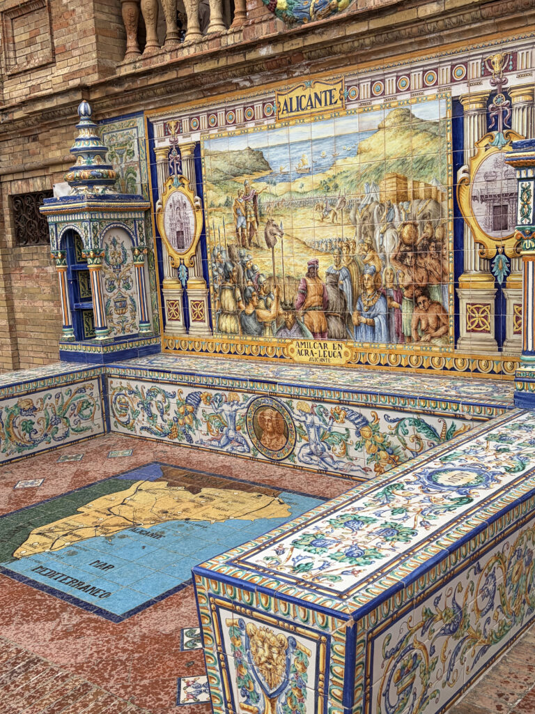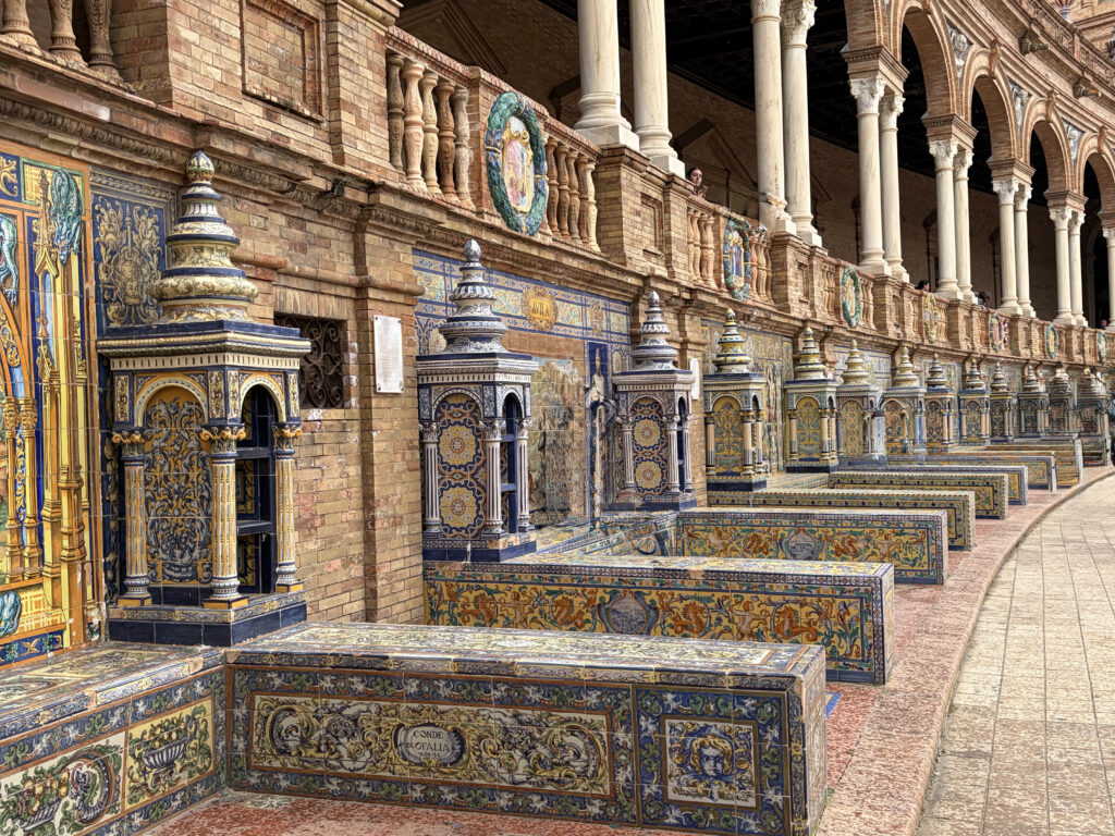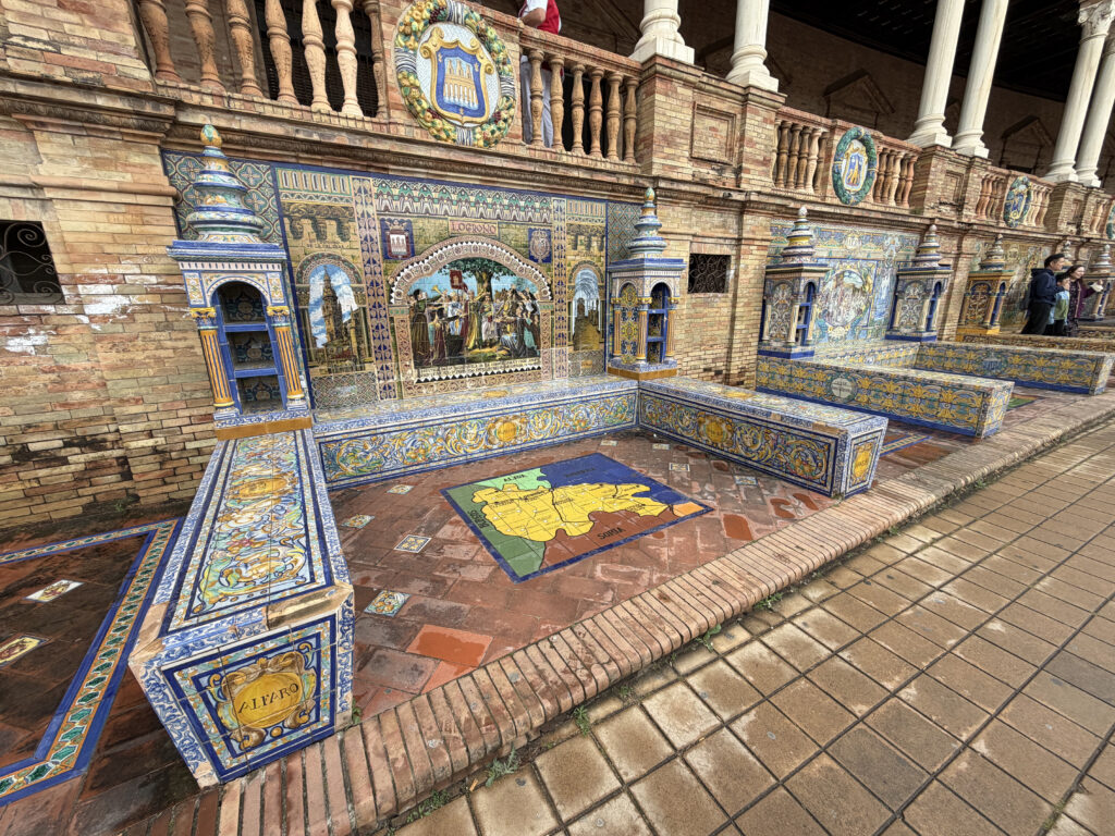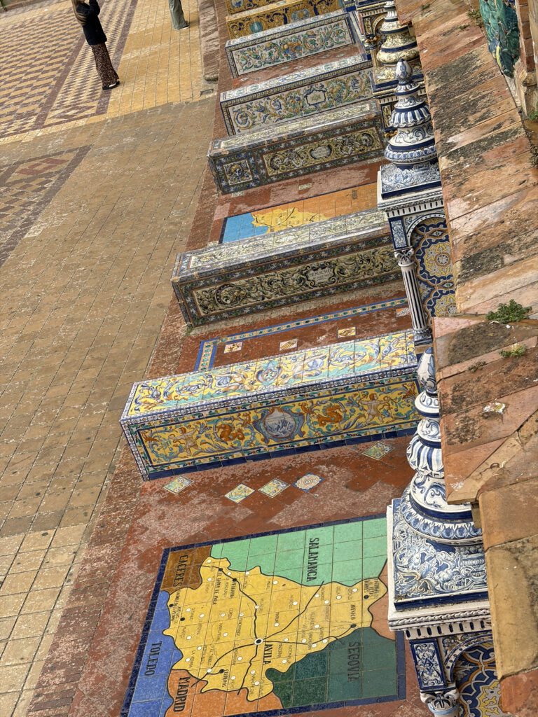At first it felt almost too perfect. The kind of place that doesn’t really look real—the sweeping half-circle, the tiled alcoves, the water running quietly through the canal. It was built for the 1929 Ibero-American Exposition, meant to show off Spain’s reach and identity at the time, and you can feel that intention in everything. Each little tiled bench represents a different province, like the whole country gathered into one place, frozen in ceramic.