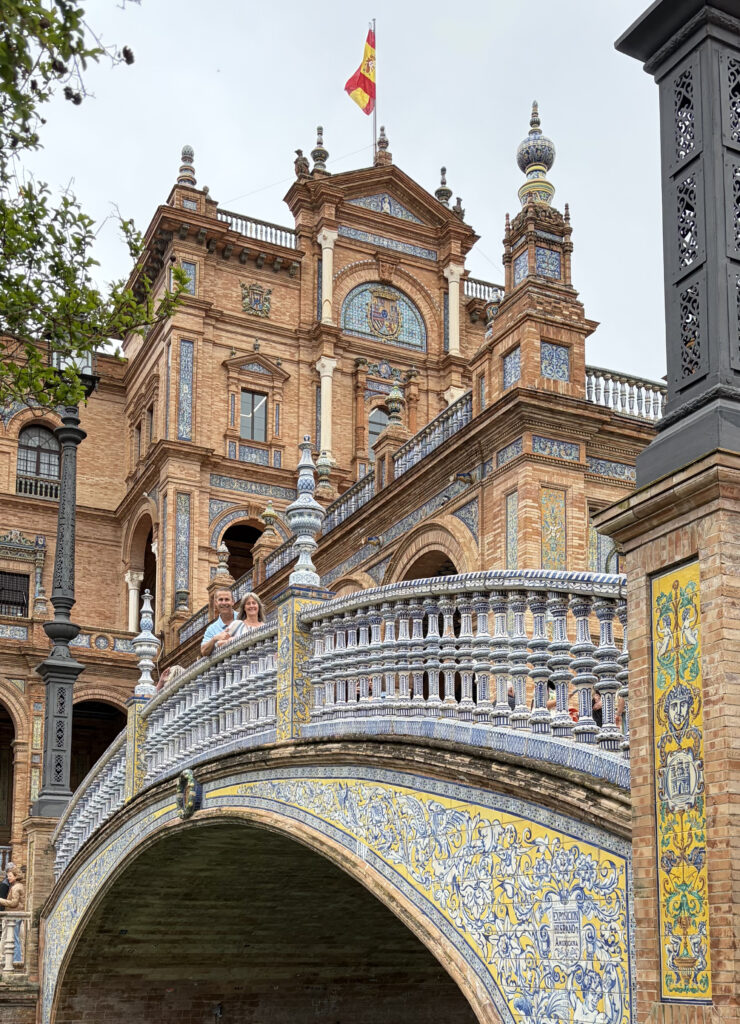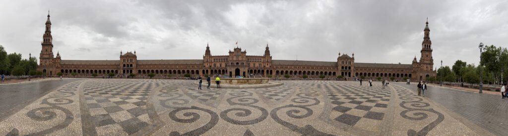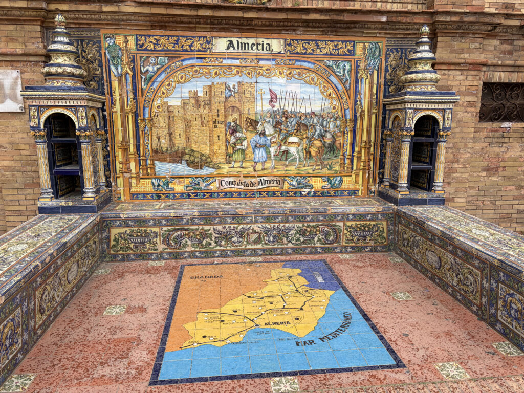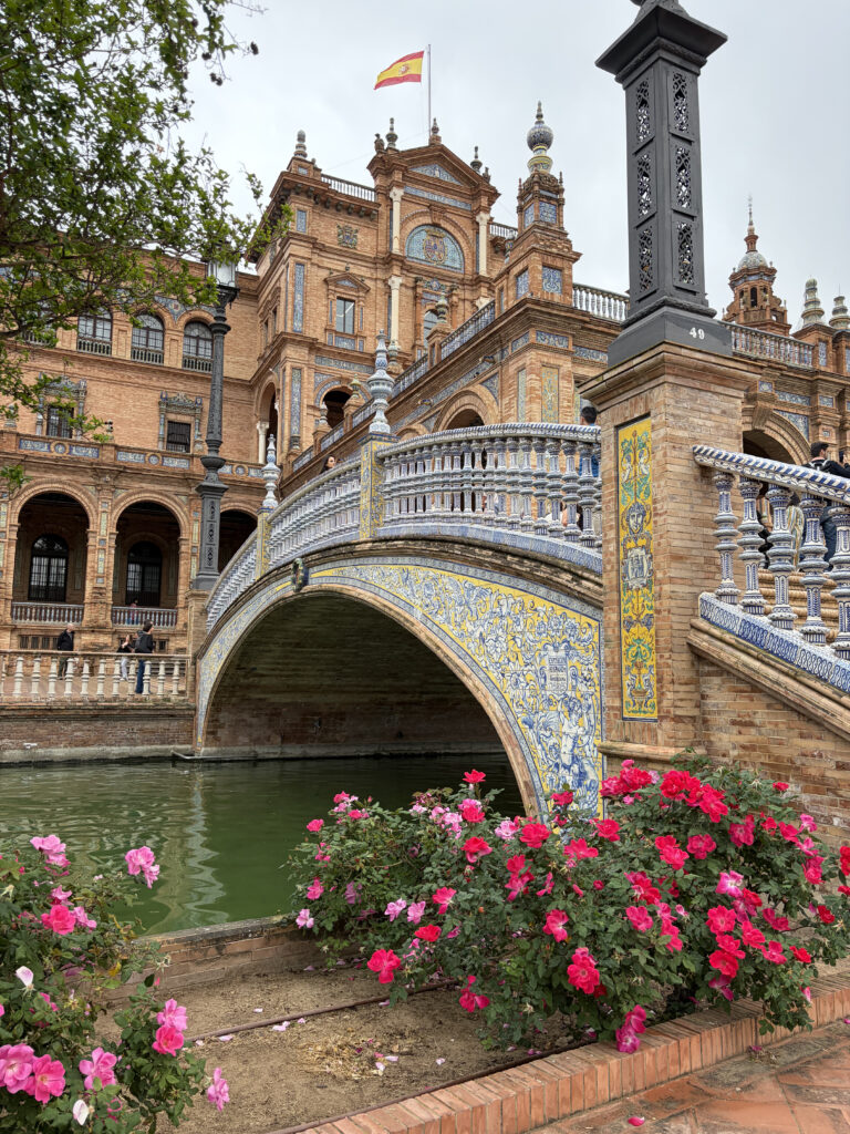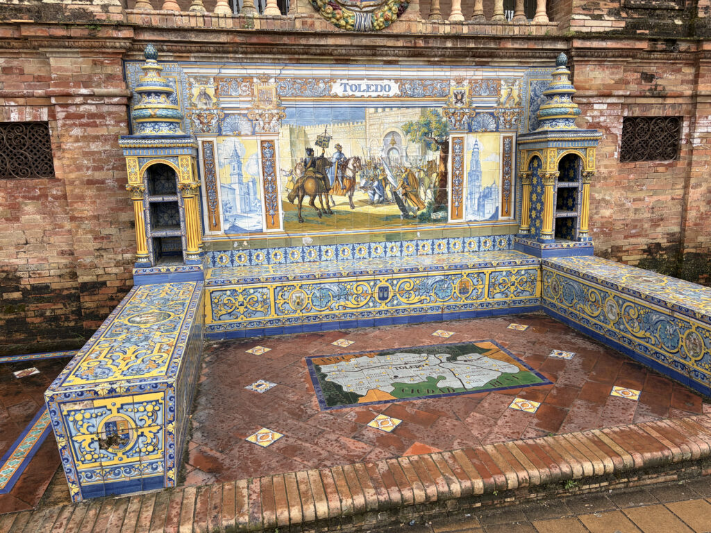 At first it felt almost too perfect. The kind of place that doesn’t really look real—the sweeping half-circle, the tiled alcoves, the water running quietly through the canal. It was built for the 1929 Ibero-American Exposition, meant to show off Spain’s reach and identity at the time, and you can feel that intention in everything. Each little tiled bench represents a different province, like the whole country gathered into one place, frozen in ceramic.
